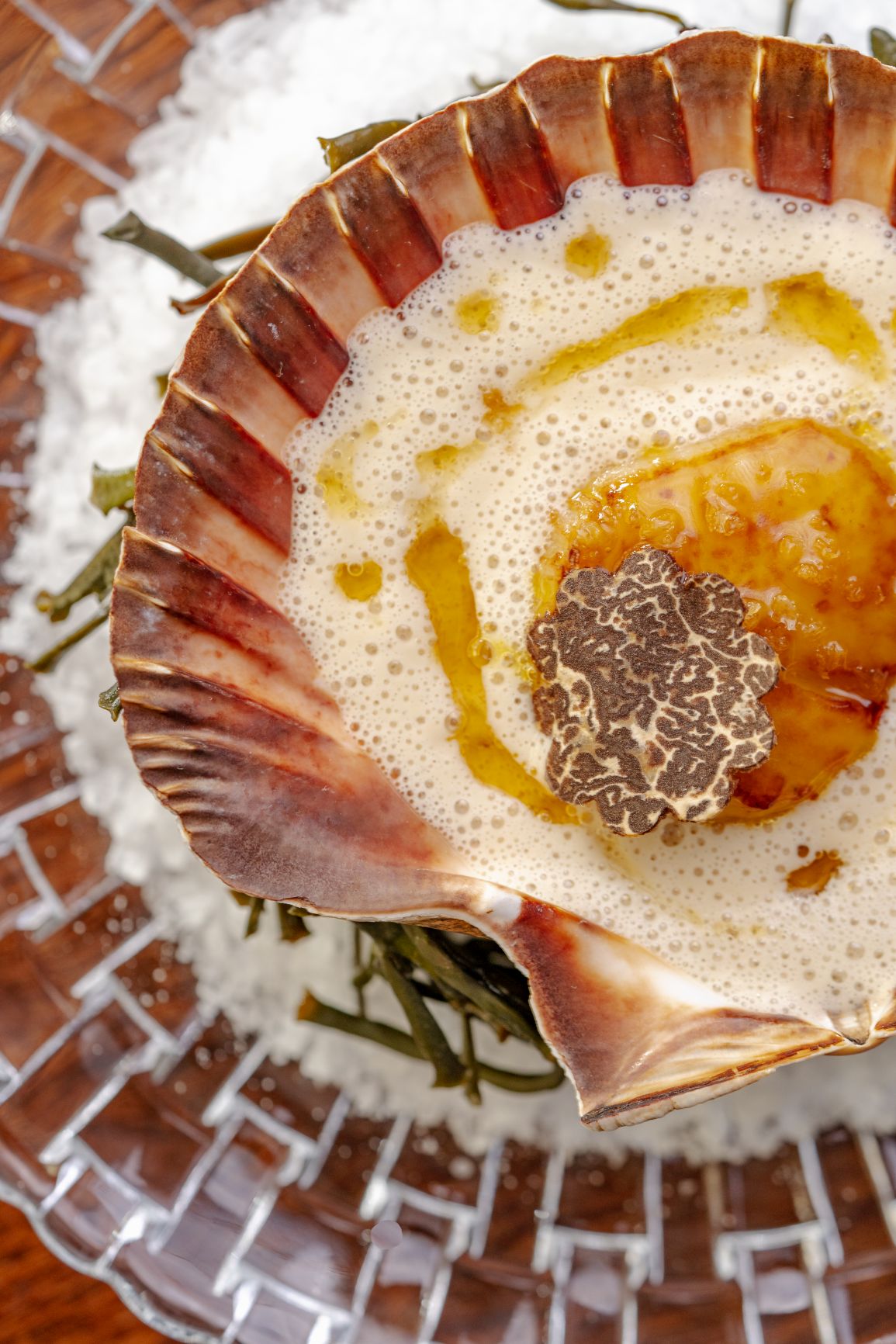 Ostryga Gillardeau zapiekana z parmezanem w sosie rybnym fumet i grzankami