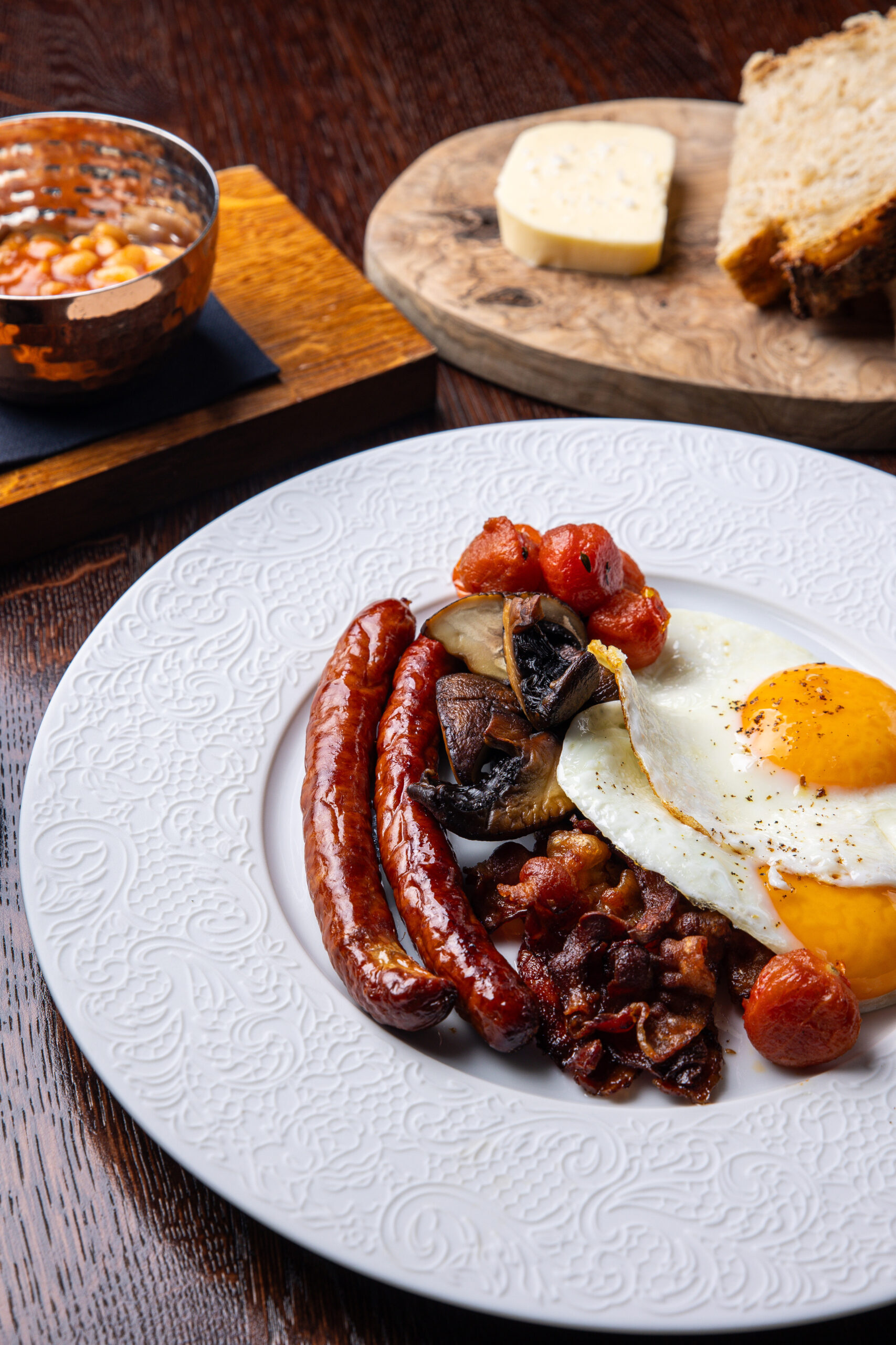 jajko sadzone, frankfurterki, fasola w sosie, pieczone
